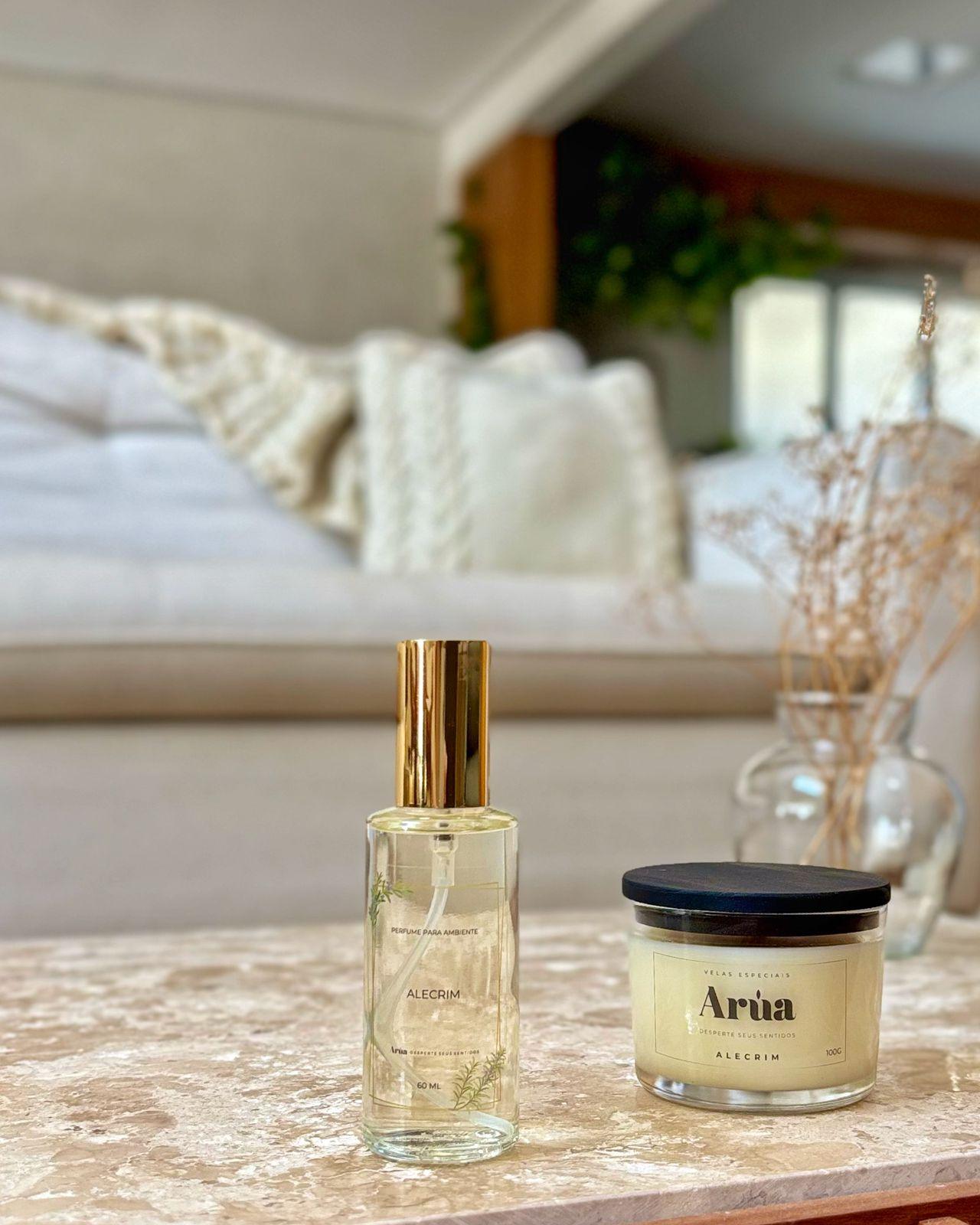 O frescor herbal do Alecrim Arúa em dois formatos complementares: vela e home spray.