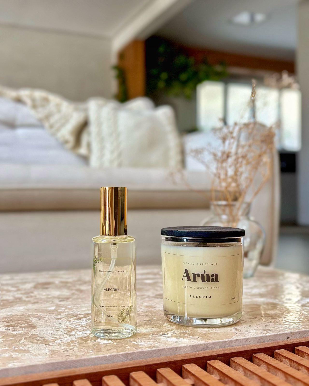 O frescor herbal do Alecrim Arúa em dois formatos complementares: vela e home spray.
