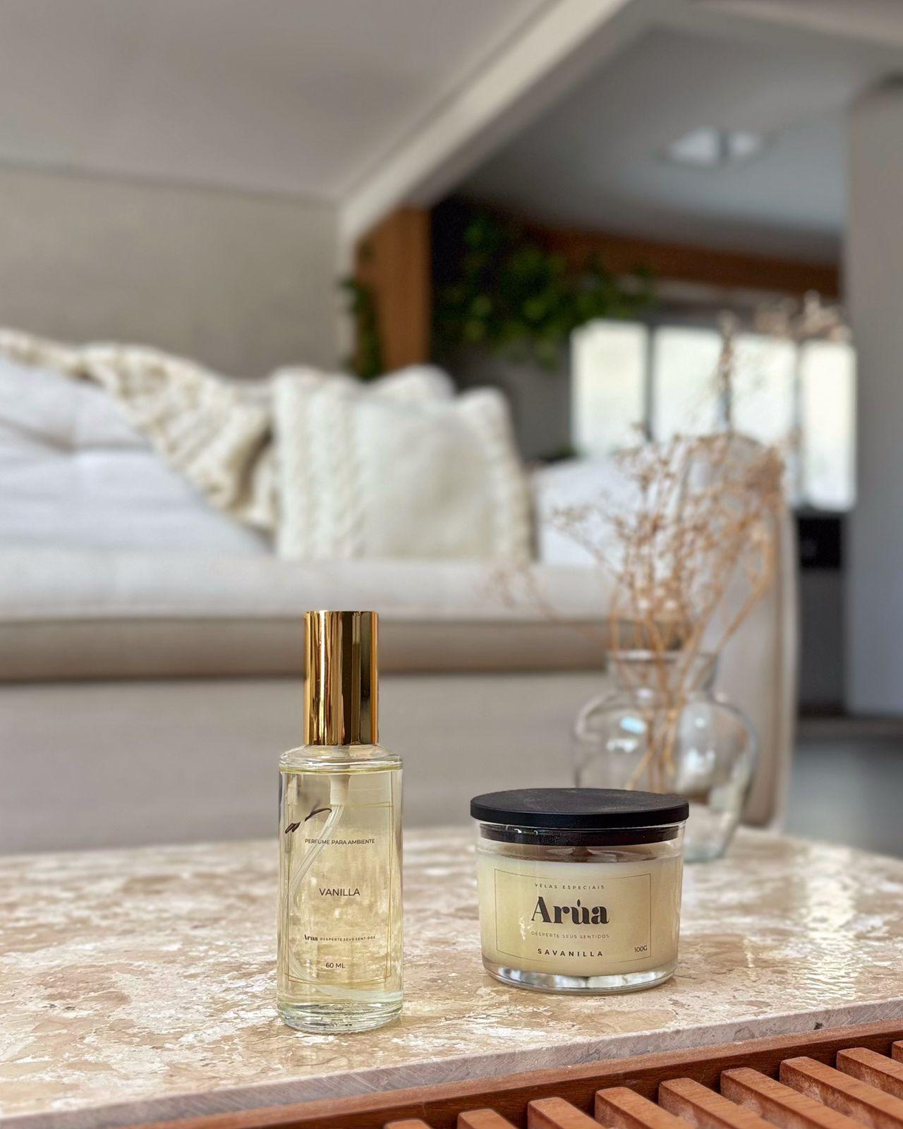 O toque sofisticado e envolvente da Savanilla Arúa reunido em vela e home spray.