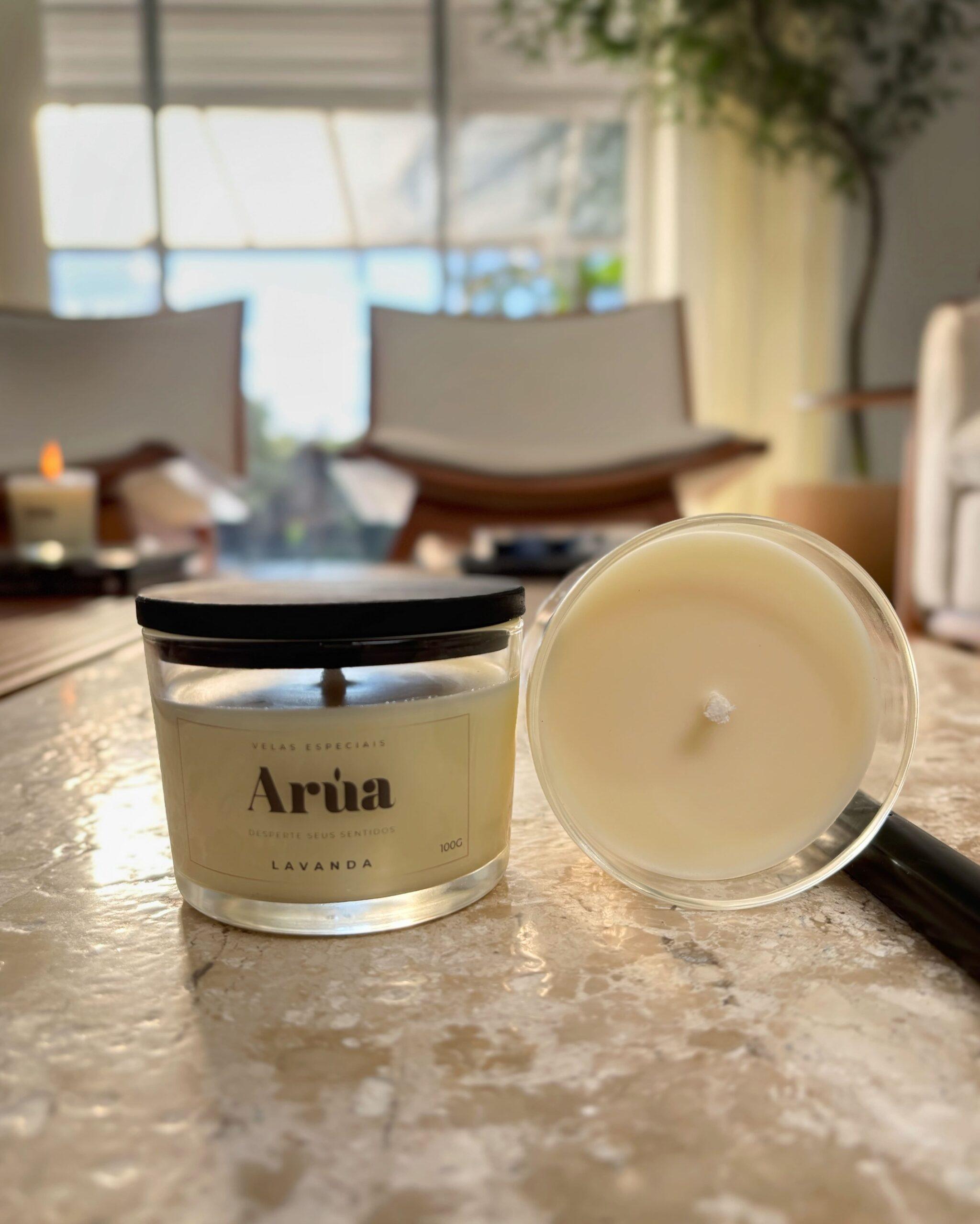 Com até 20 horas de queima limpa e uniforme, a Vela de Lavanda Arúa transforma o espaço com serenidade e estética atemporal em vidro reutilizável com tampa de madeira.
